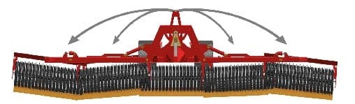 El Tip-Roller de HE-VA logra esto al contar con cinco puntos de pivote, tres pivotes centrales y dos más donde las alas están unidas a la sección central. Cada sección se mueve de manera independiente. Esto permite que el rodillo siga los contornos del bancal en las condiciones de terreno más irregulares, y garantiza un contacto constante entre los anillos del rodillo y el suelo.